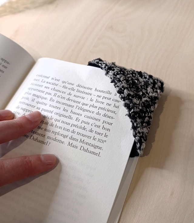 Découvrez votre nouveau compagnon de lecture : un marque-page unique, façonné à la main à partir de chutes de tissus upcyclés. Parfait pour accompagner vos séances cocooning cet hiver, il se glisse facilement dans vos livres grâce à son format 7 x 7 cm.