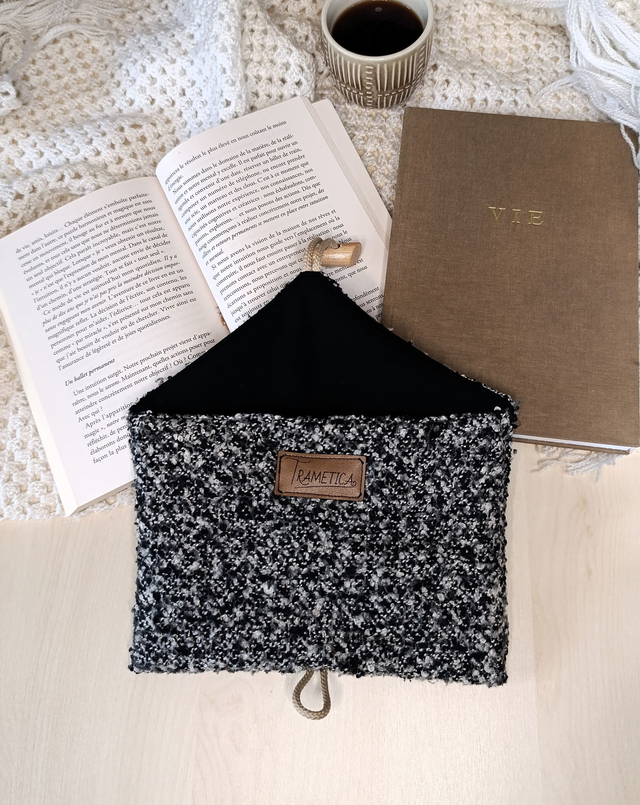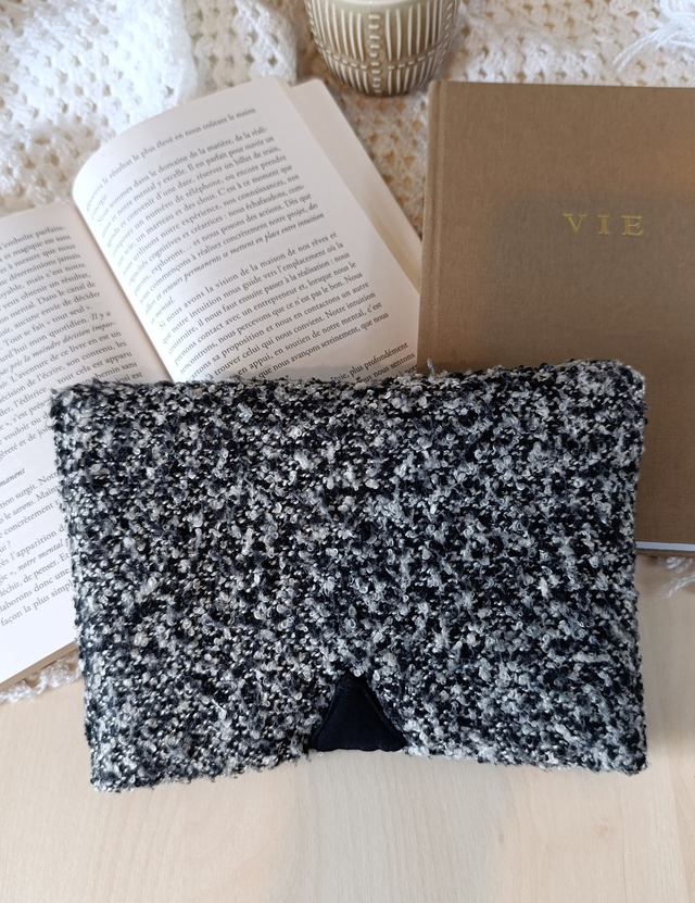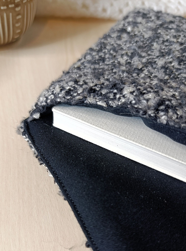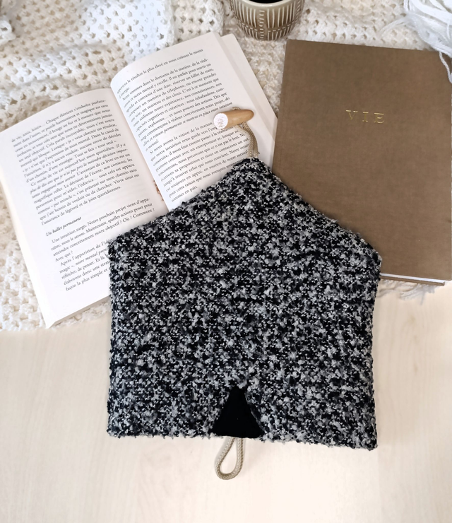 Fabriquée à partir de tissus upcyclés (le tissu extérieur était une écharpe que j'ai transformée) et renforcée avec une ouate moelleuse, elle offre une protection douce mais efficace pour transporter partout son livre du moment ou son carnet préféré.